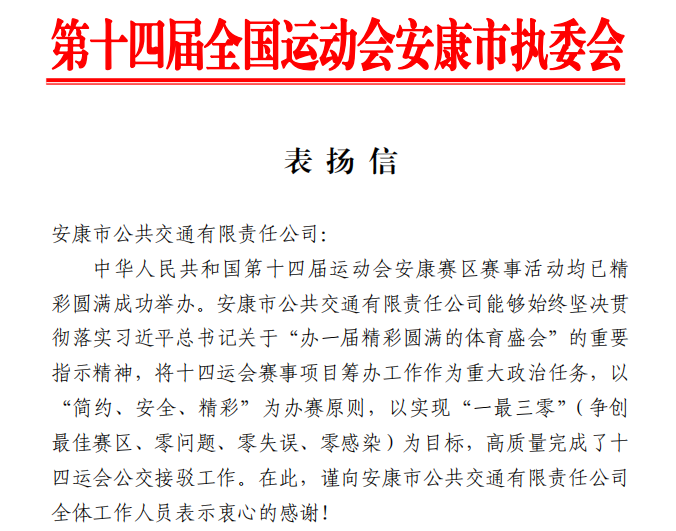 近日,第十四届全国运动会安康市执委会向PA视讯发来表扬信,对公交公司高质量完成十四运会公交接驳工作表示感谢。